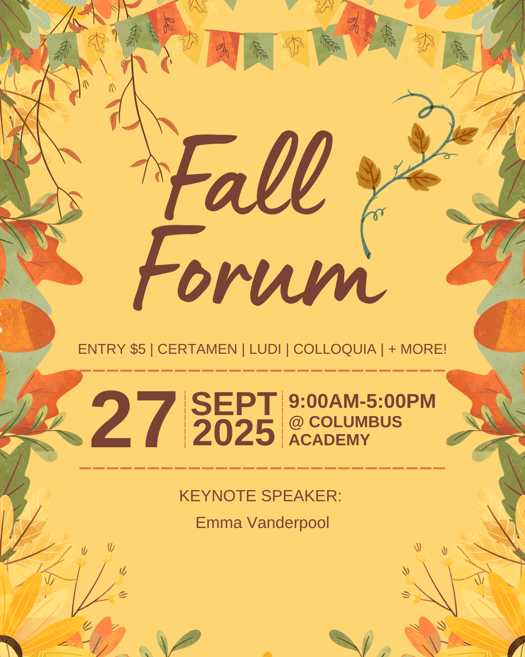Sat Sept 28: 9 am – 5 pm, Fall Forum, Columbus Academy. $5/student, and pizza lunch + snacks are provided.